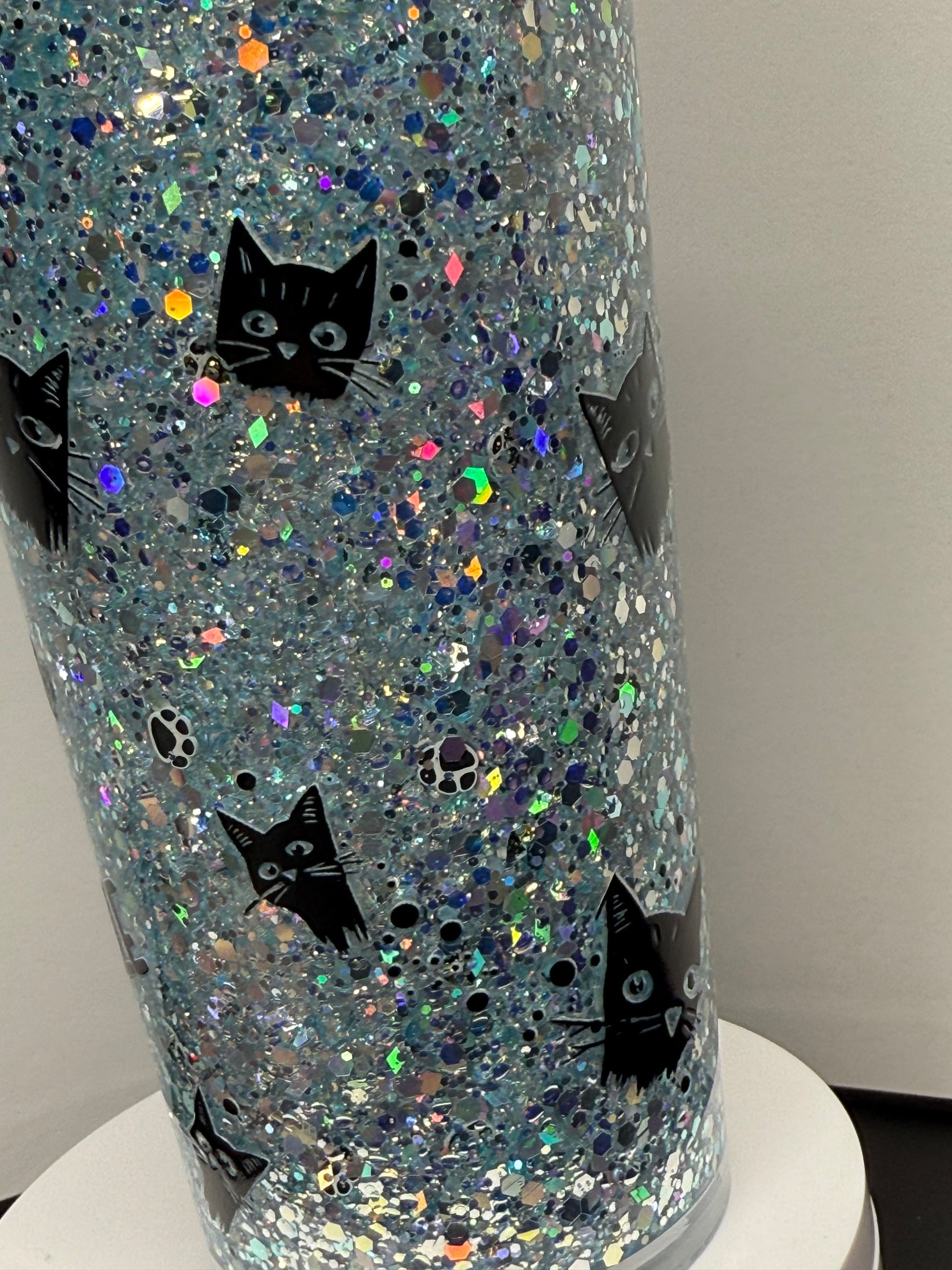 Silver-blue glitter with floating paw prints, black cat designs, and the phrase “I like cats & maybe 3 people.” A sparkly must-have for cat lovers!