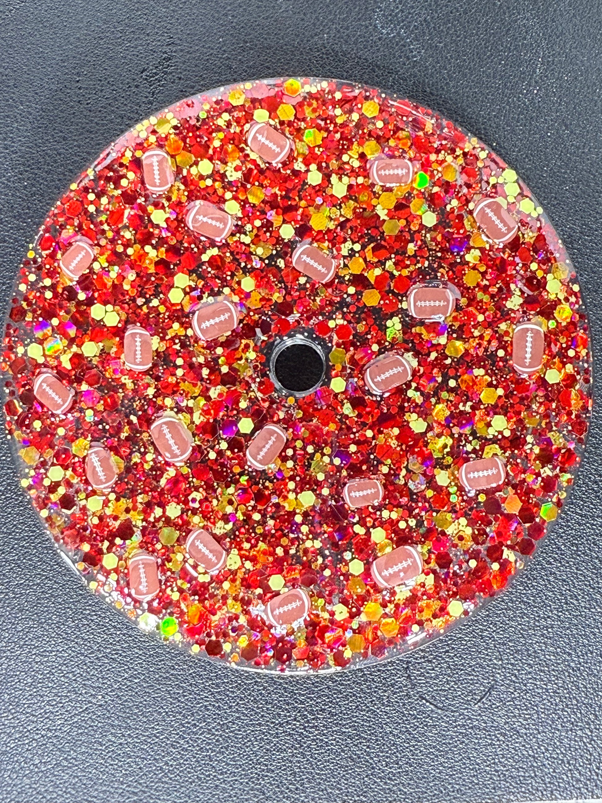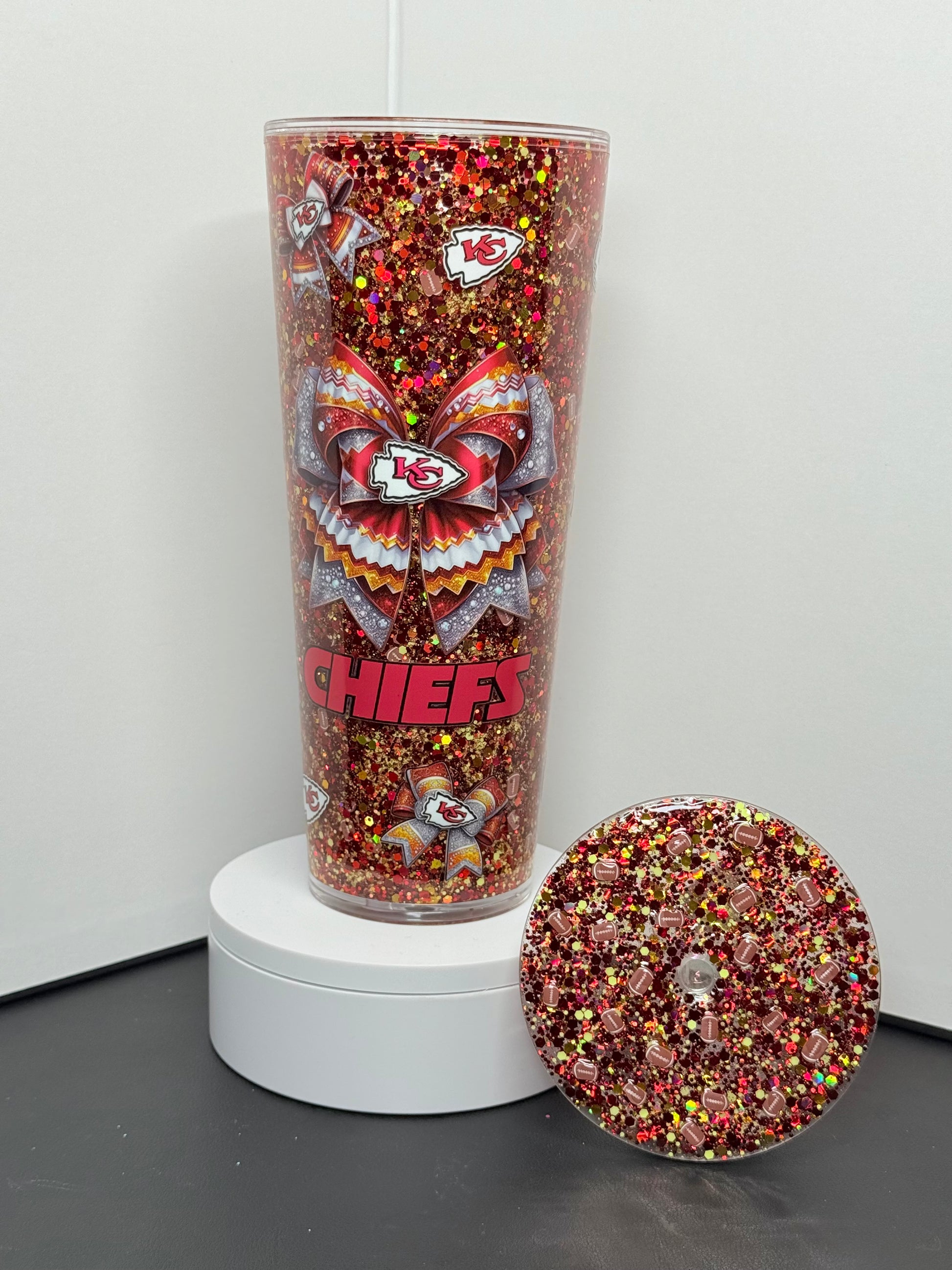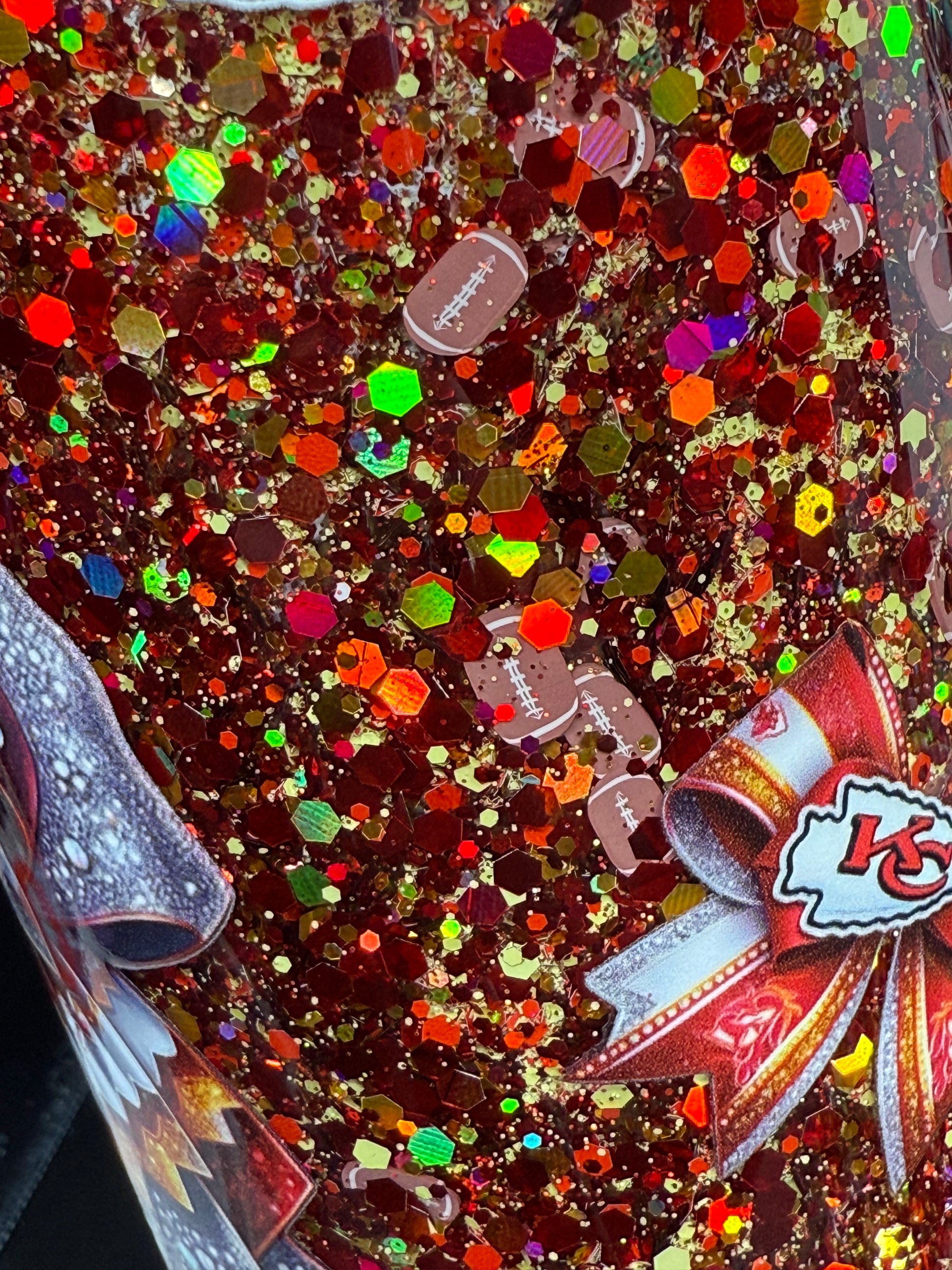24oz glitter tumbler with peek-a-boo footballs, sparkling lid with mini footballs 🏈, and Chiefs design — perfect for cold drinks and game day pride!